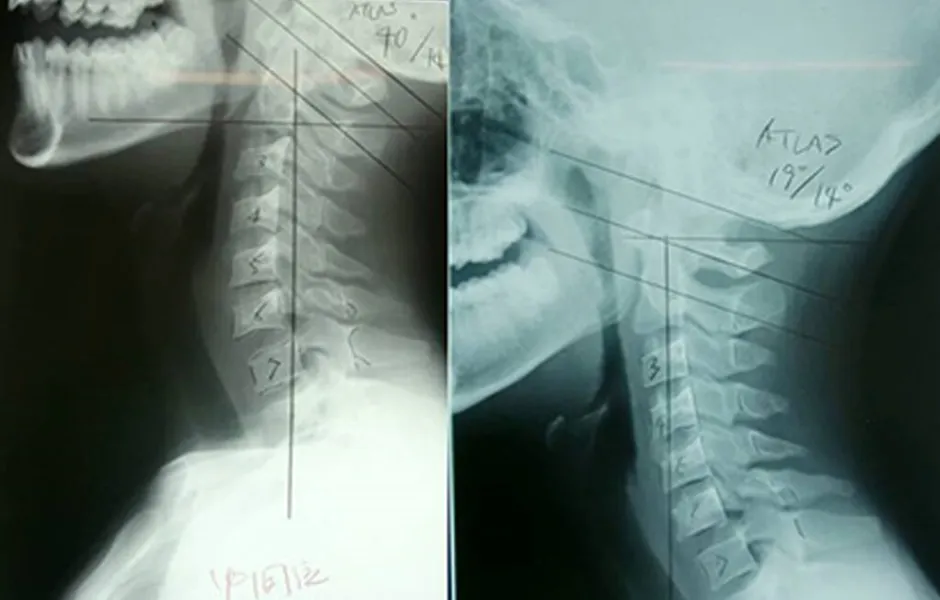 第一頚椎(アトラス)を正常な位置に戻すと、重心が変わり骨組みは正しい配列を取り戻します。(赤線)