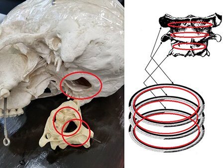 頭蓋骨の孔と第一頚椎(アトラス)の孔・第二頚椎(アキシス)の孔は、水平垂直に揃っていなければなりません。