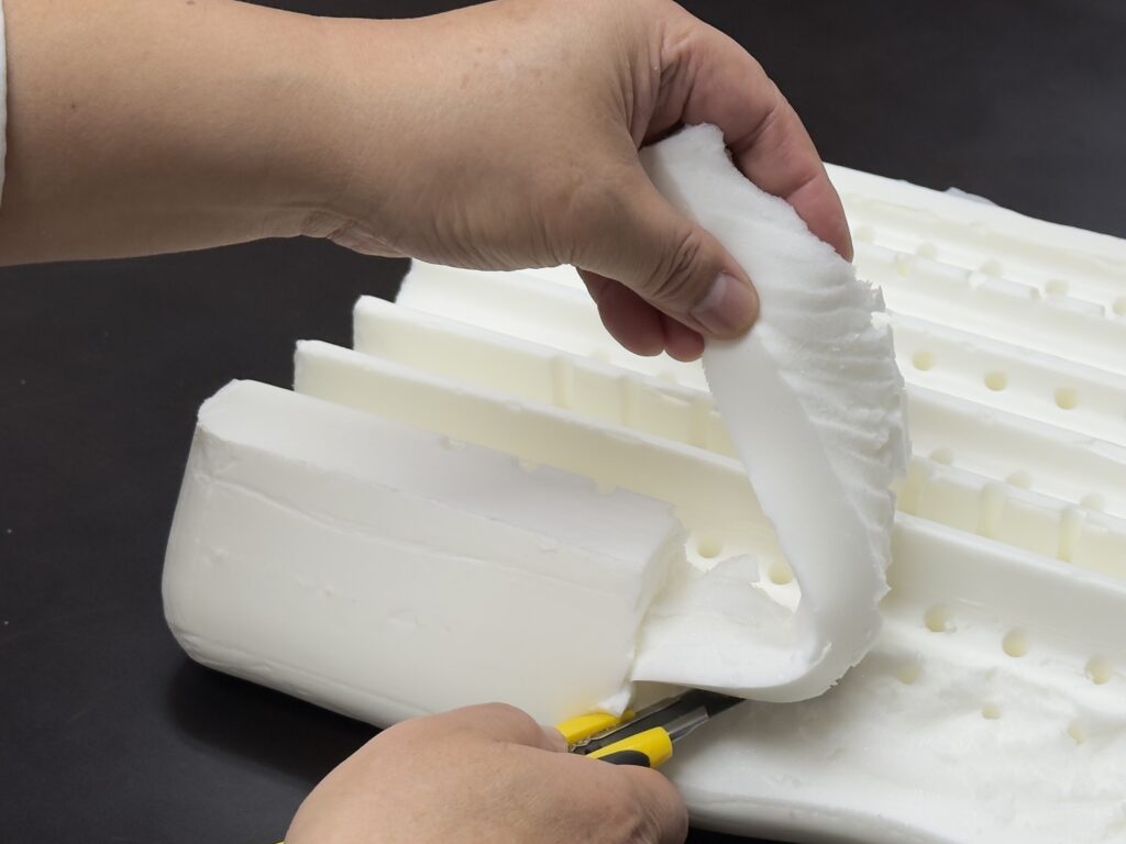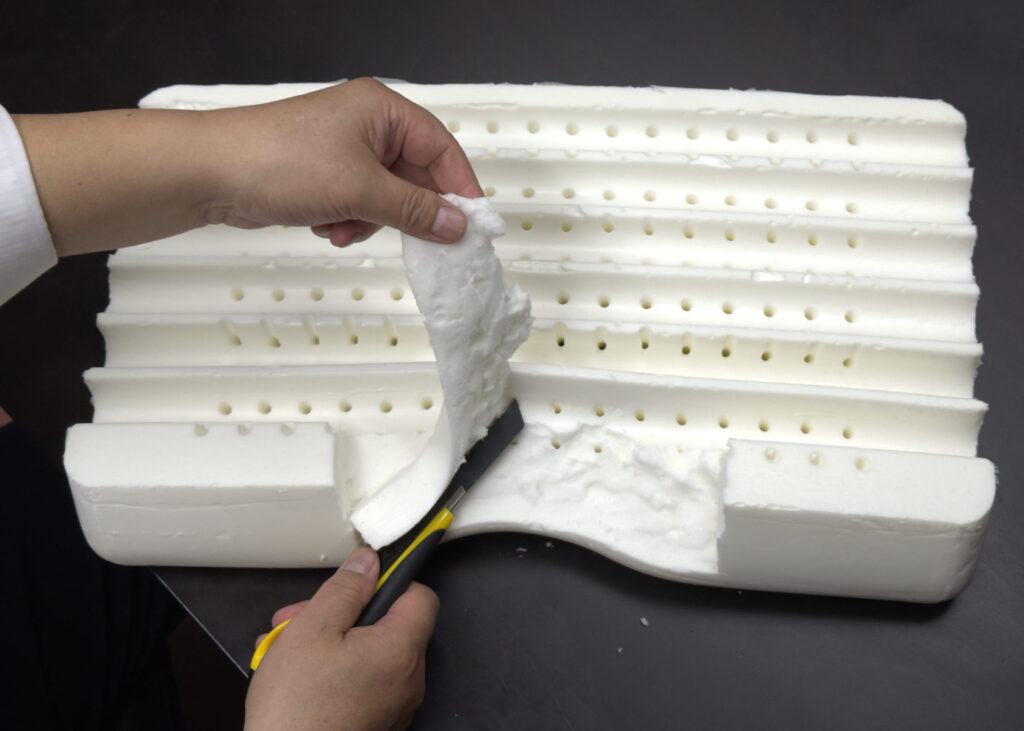 頚椎の悪い人のための枕を独自に開発し、患者様おひとりおひとりに合わせて、専門性を生かしてカットしてお渡ししております。